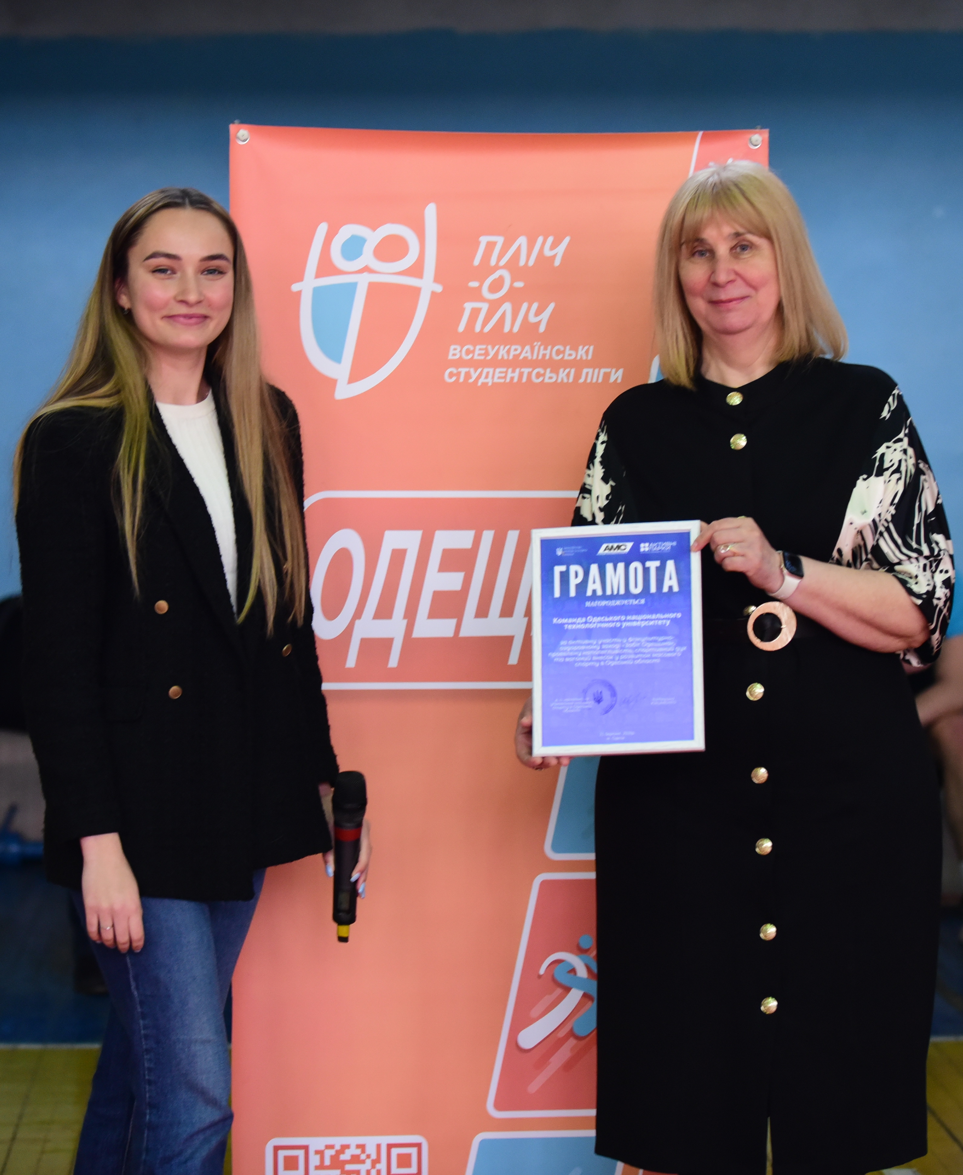 Під час відкриття змагань ректор ОНТУ Лариса Іванченкова отримала Грамоту за вагомий внесок університету у розвиток масового спорту в Одеській області.