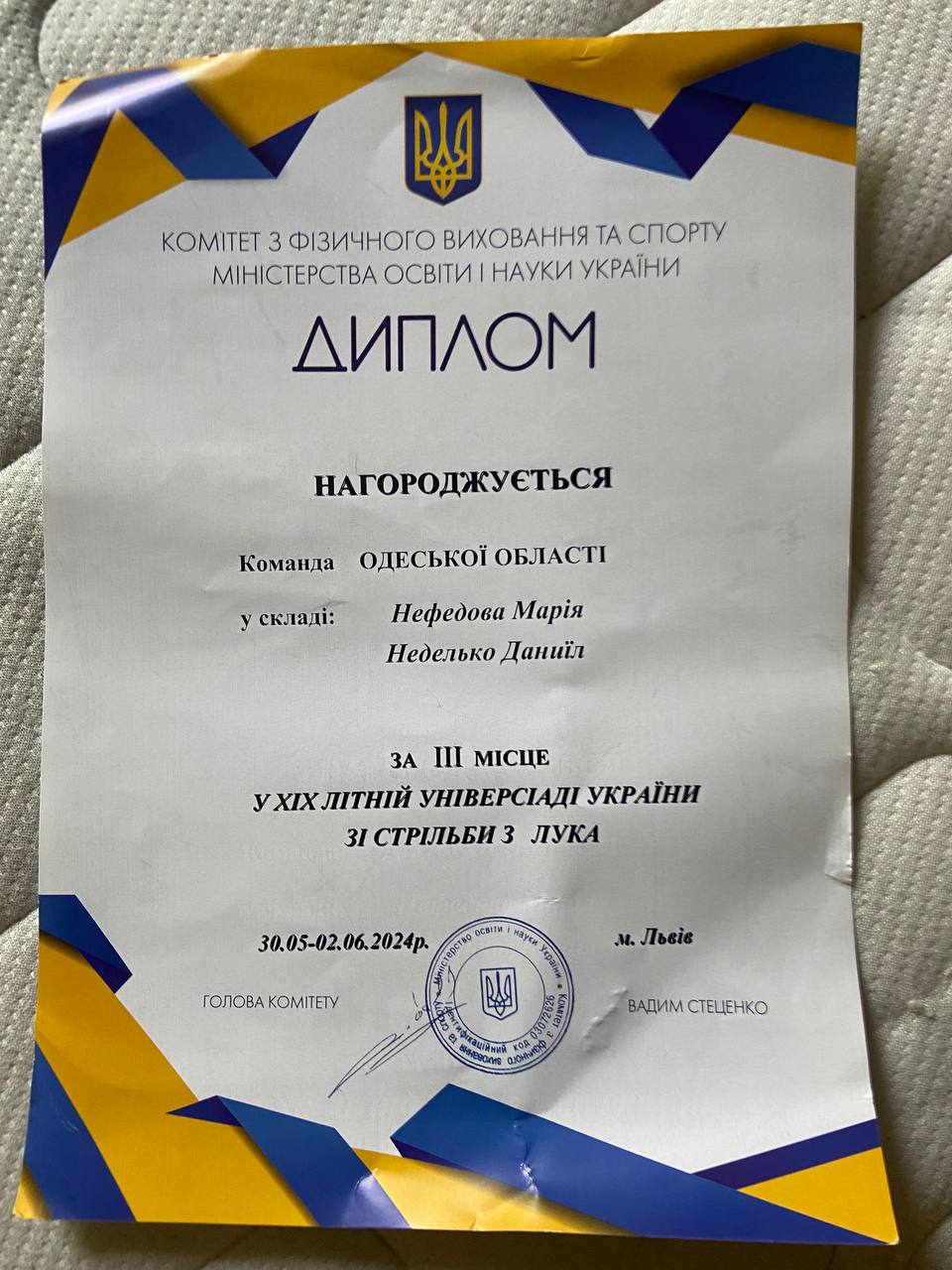 Експертизи, біотехнології, харчової інженерії, підприємництва та торгівлі НЕФЕДОВУ МАРІЮ, яка у складі команди Одеської області стала бронзовим призером ХІХ Літньої Універсіади України зі стрільби з лука.